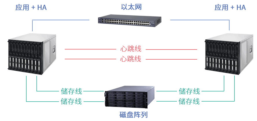 務(wù)器提供計(jì)算資源,兩臺(tái)存儲(chǔ)提供存儲(chǔ)資源,建立雙機(jī)熱備系統(tǒng)。