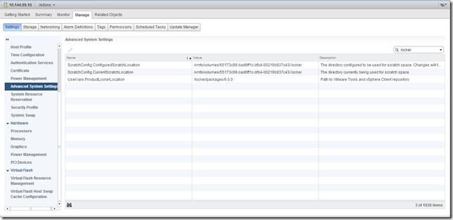 現(xiàn)在我們有了一個新的VMware Tools 文件共享位置,選擇一個主機,轉到Manage > Settings >Advanced System Settings > UserVars.ProductLockerLocation。