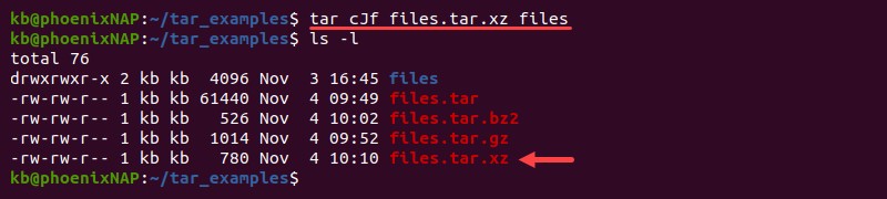 使用-J標簽以 tar.xz 格式壓縮檔案: