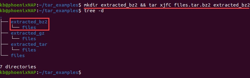 mkdir extracted_bz2 && tar xjfC files.tar.bz2 extracted_bz2