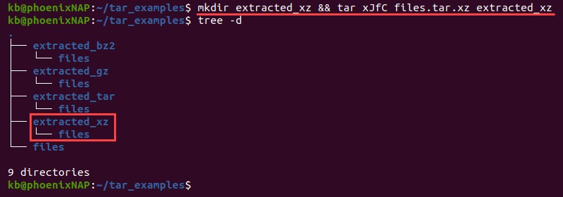 例如,創(chuàng)建一個目錄并提取files.tar.xz內容: