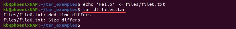 下面的步驟展示了如何使用-d, --diff,或--compare標簽tar: